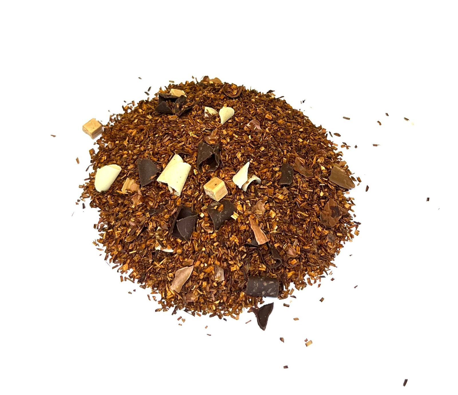Rooibos Chocolate Toffee: Deliciosa mezcla de rooibos con chocolate blanco, chocolate negro, caramelo y cáscara de cacao. Un capricho dulce y sin cafeína para cualquier momento del día.