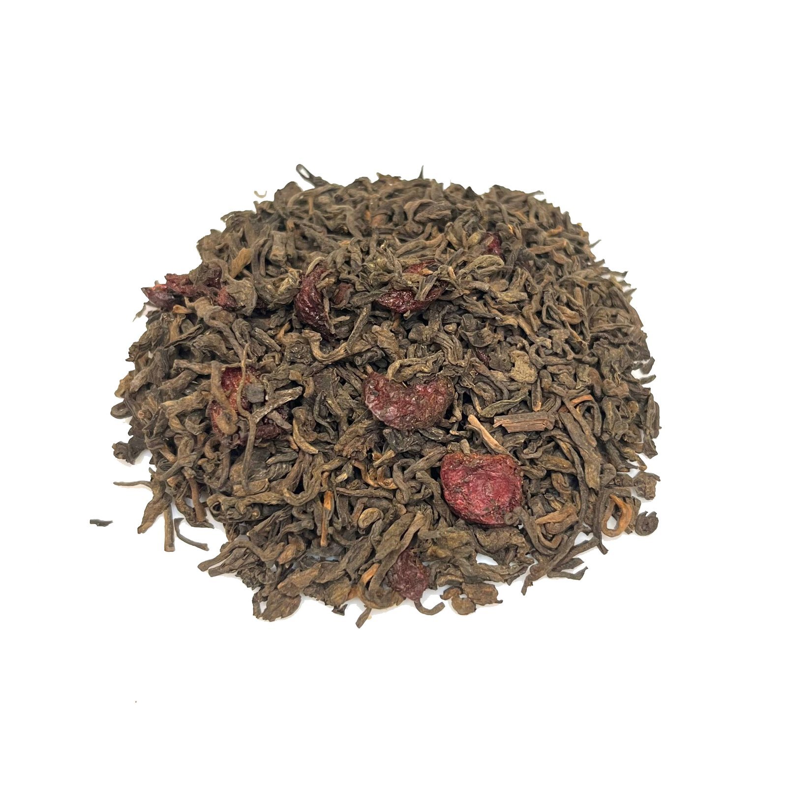 Disfruta del Té Rojo Cereza Japonesa, una mezcla delicada de Pu Erh, cereza liofilizada, pétalos de rosa y aroma, que ofrece una experiencia refrescante y aromática con un toque frutal.